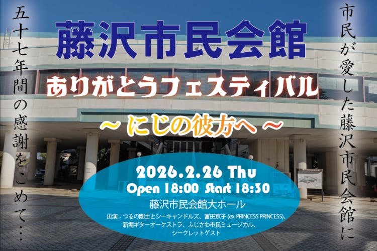藤沢市民会館は、1960年代の開館以来、60年近くにわたり市民の文化・芸術・音楽活動を支えてきました。2026年3月に建て替えの為一旦閉館を迎えるにあたり、その歴史に感謝を捧げるともに、新しい市民会館の誕生を未来への希望として祝う記念イベントを開催いたします。
