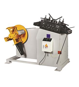 (1) Powered decoiler. The powered type decoiler is driven by the motor through the belt of the reducer, and the main shaft drives the decoiler to rotate, thereby realizing the function of discharging and decoiling. In order to ensure synchronization with the leveling part, the powered decoiler is equipped with a light eye or a 24V frame sensor to control the opening and closing of the decoiler. When the material is drooped to a certain degree of curvature and the frame sensor is touched or the light eye is blocked, the decoiler will immediately stop running. When the material leaves the frame sensor or does not block the light eye, the decoiler will restart to the feeding to realize fully automatic opening and closing.