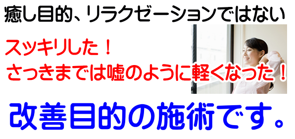 しびれ、足のむくみ、頭が痛い、腰が痛い、眠れない、痩身、体の不調、様々な症状、寝つきが悪い、眠りが浅い、筋肉痛、頭が重い、疲れ、肘の故障、足がだるい、首の痛み、肩こり、目の疲れ、背中が痛い、冷え性、歩くのがつらい、ギックリ腰、立ちくらみ、耳鳴り、手足の痛み、関節が痛い、膝の痛み、背骨の歪み、五十肩、四十肩、O脚、X脚、肩幅/骨盤矯正、小顔、その他