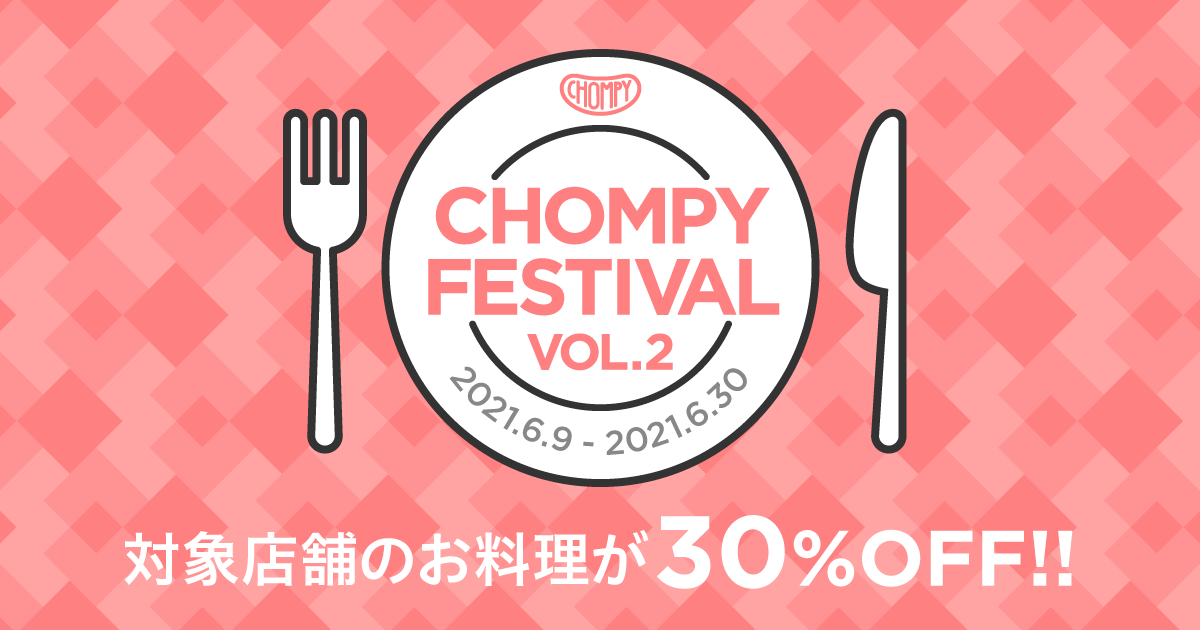 Chompyフェス Vol.2 開催!新しくオープンしたエリアのお店が大集合! | Chompyフェス Vol.2 Chompy(チョンピー) 国内発の新しいフードデリバリー新しくオープンしたエリアのお店が大集合😋いまだけお得な「Chompyフェス Vol.2」を開催中!🎉Chompyフェス開催中は 対象店舗で30%OFF &手数料無料!chompy.jp