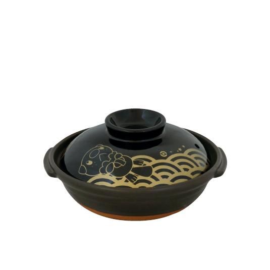 シックな黒の土鍋に金色のラインでミジュマルがデザインされた大人っぽい和風のデザインです。