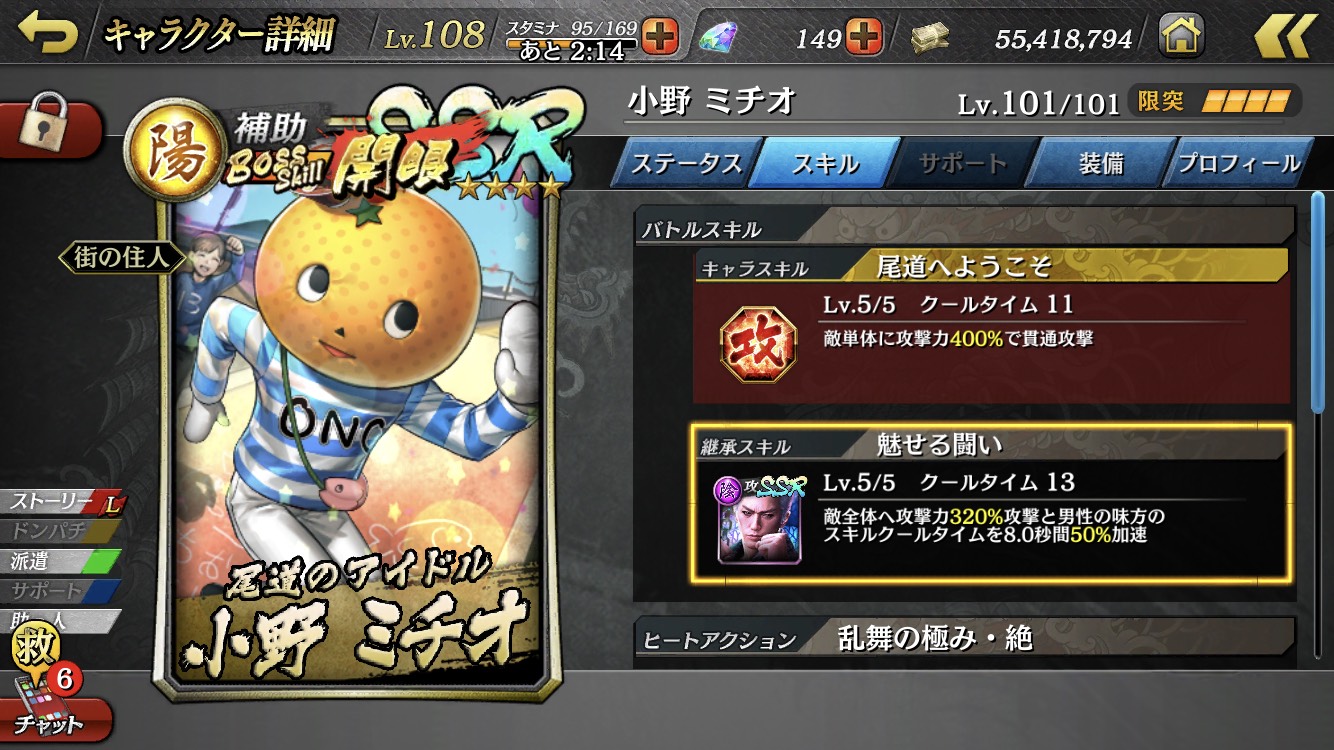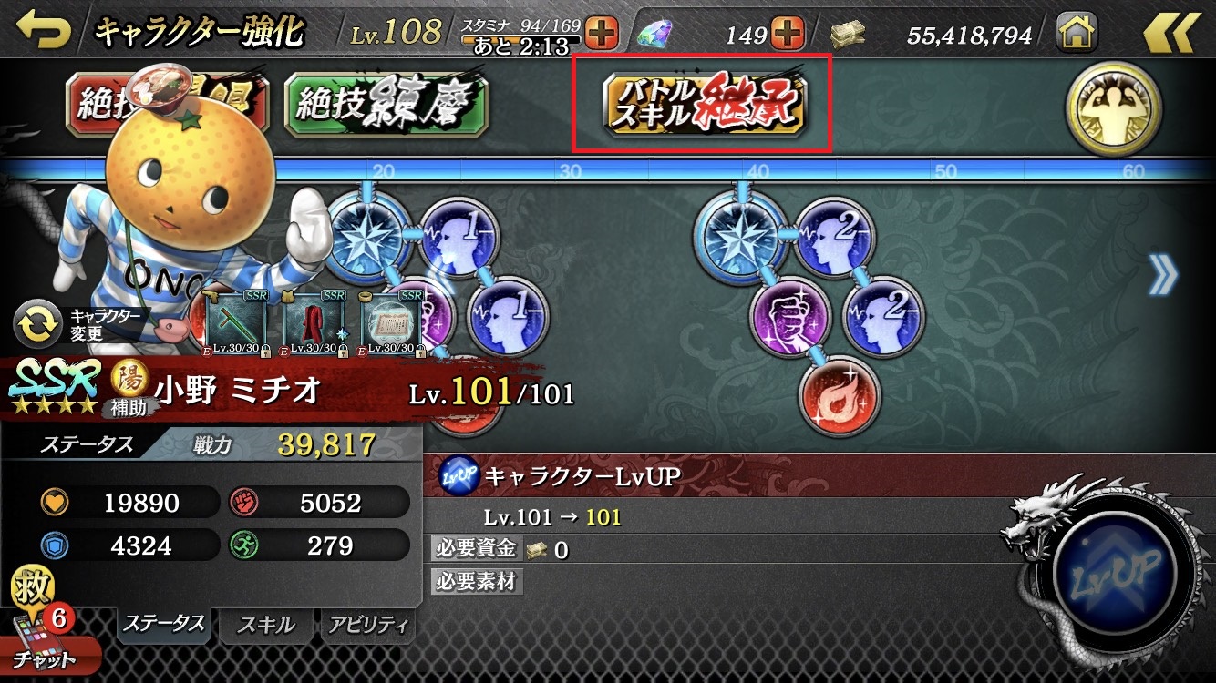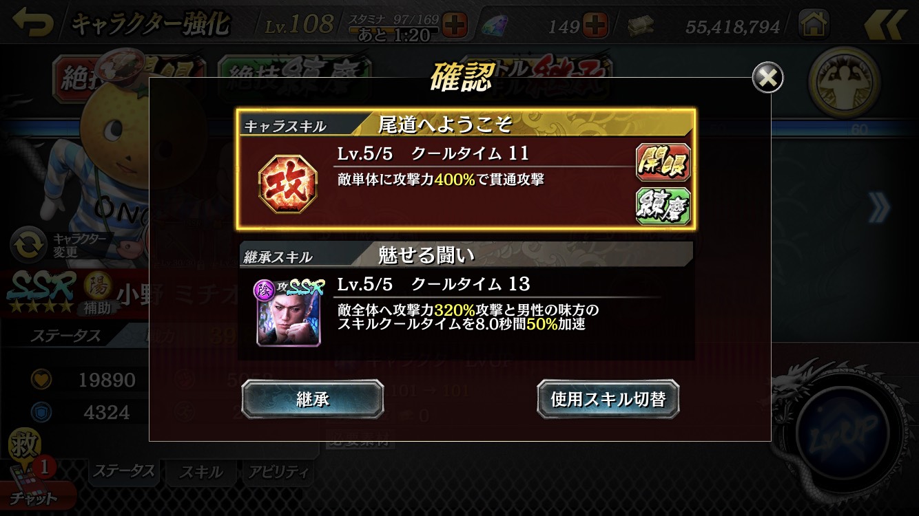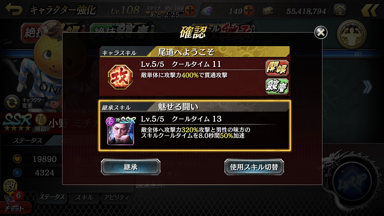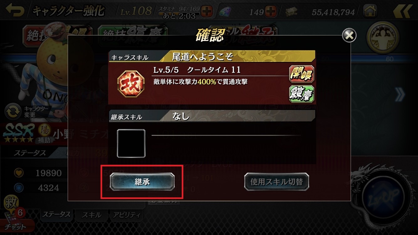 4. Make sure the character with the battle skill you want to inherit is selected, then touch the "継承(Inherit)" button.