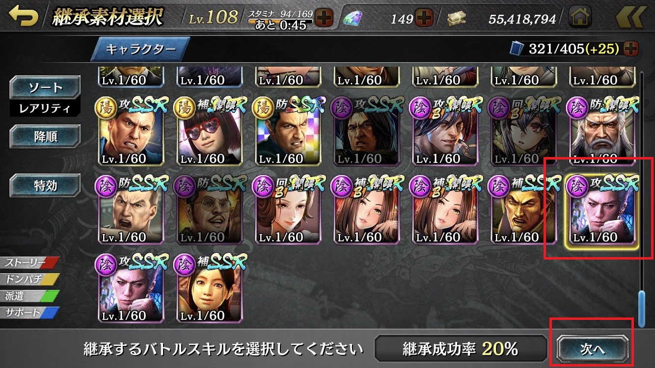 3. Select the character with the BattleSkill you wish to inherit and touch the "次へ(Next)" button in the red frame.