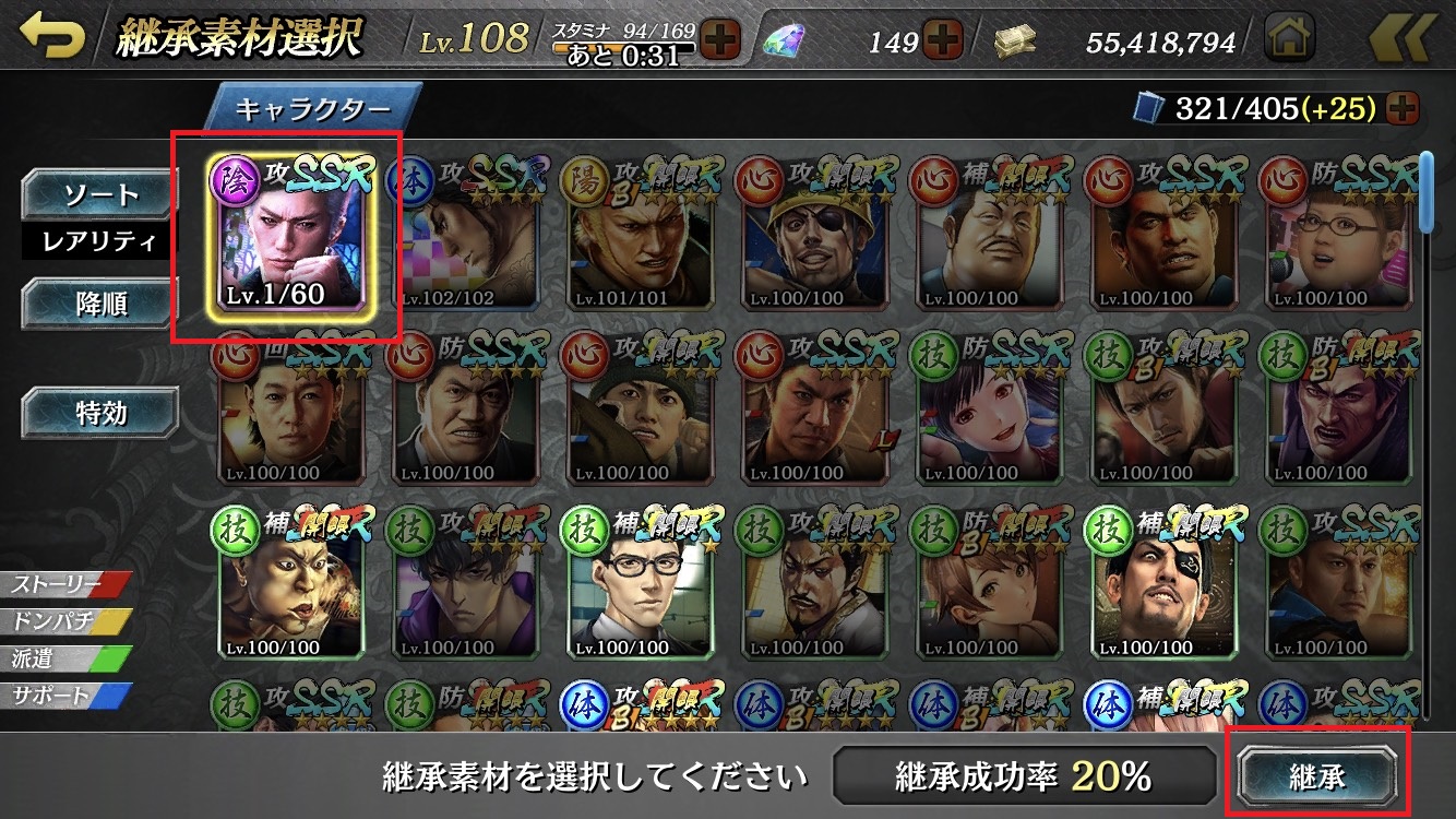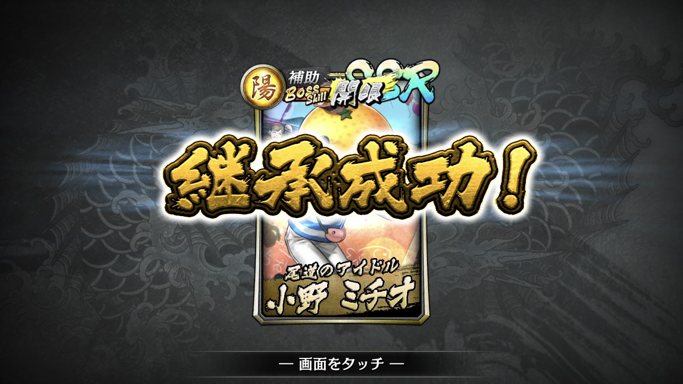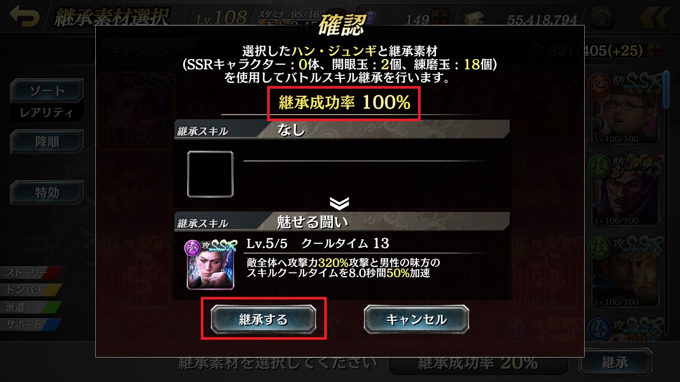 6. Adjust the gauge so that the "継承成功率(Succession Success Rate)" reaches 100%, then touch the "継承(inherit)" button.
