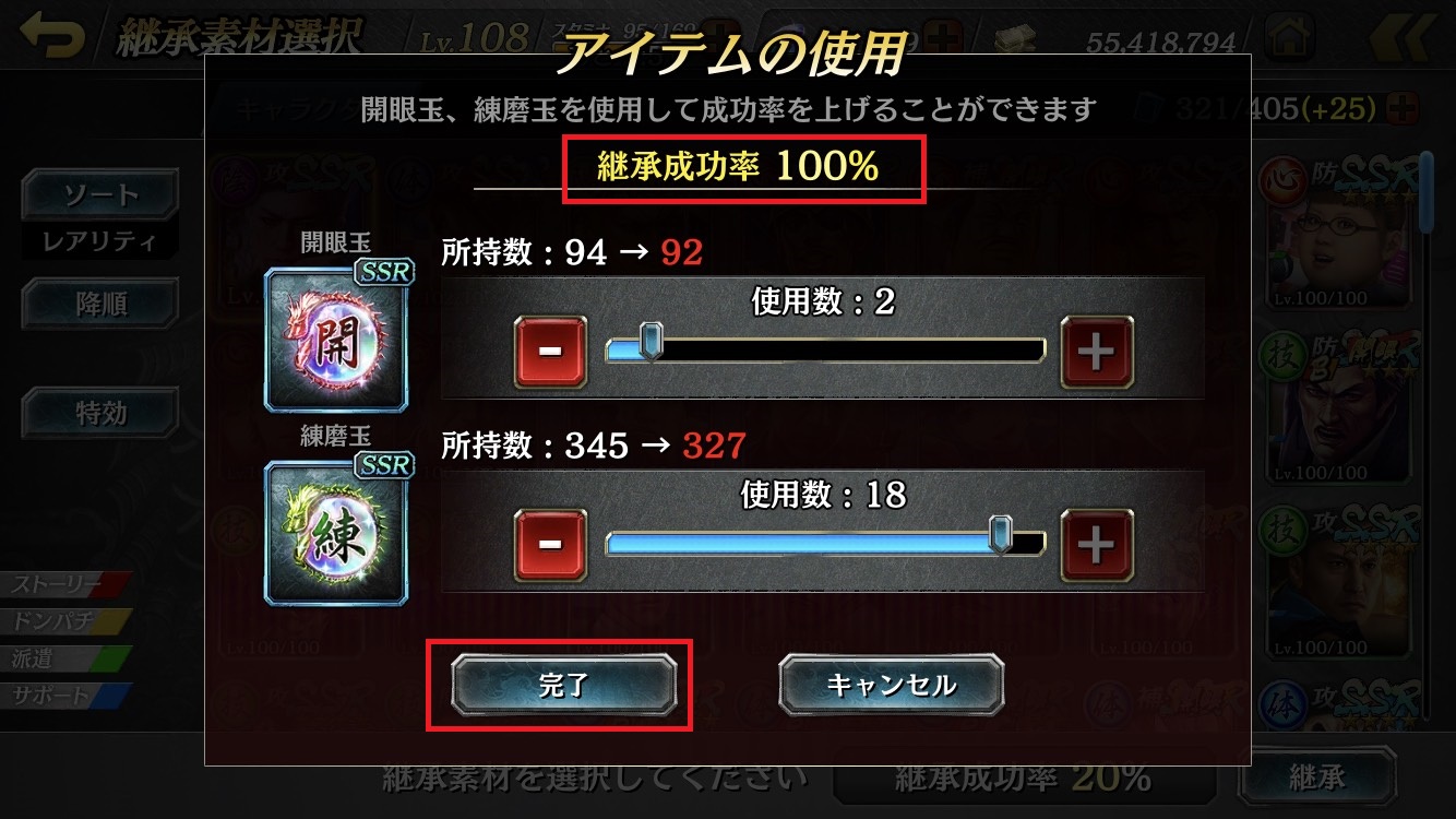 5. Adjust the gauge so that the "継承成功率(Succession Success Rate)" reaches 100%, then touch the "完了(Done)" button.