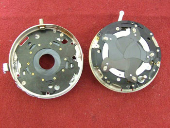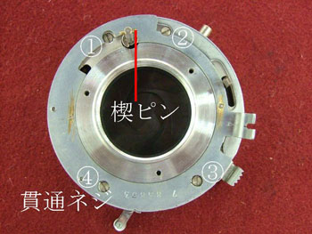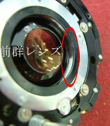 シャッター羽根を取り去ると前群レンズを取り付ける線条(赤丸部)が見える。