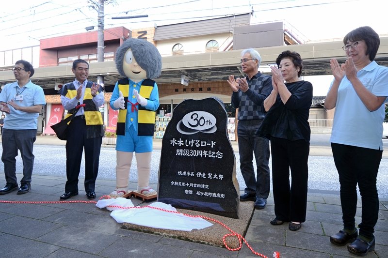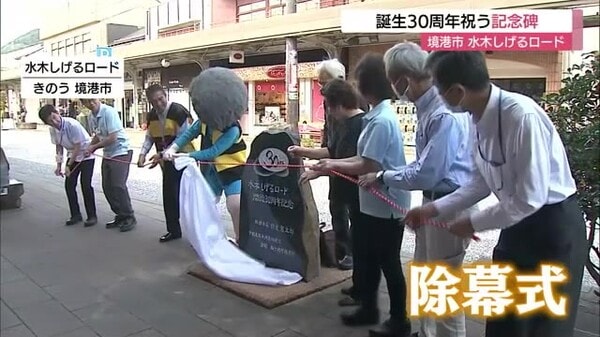 30年の感謝と水木しげるロードがこれからも50年、100年と続くよう願いを込め、「水木しげるロード開設30周年記念碑」の除幕式が行われまし た。