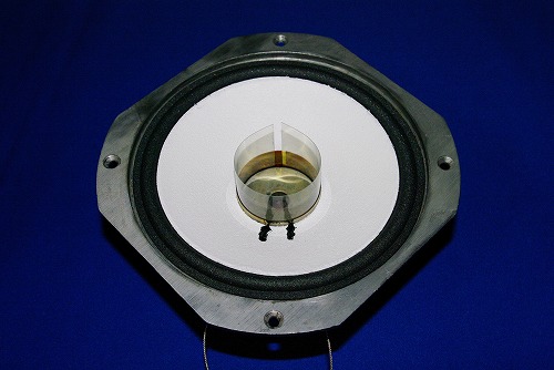 コーンアッセンブリーを装着したところです。ボイスコイルのセンター出し用のフィルムを立てて