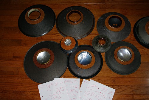 その作業の関連で、オリジナルパーツ(純正品の意味です。例えば、JBL製のパーツと言う意味です。)を確認する必要があり、今まで集めたパーツを出してきて、大きさや重さ、その他特長をメモしました。