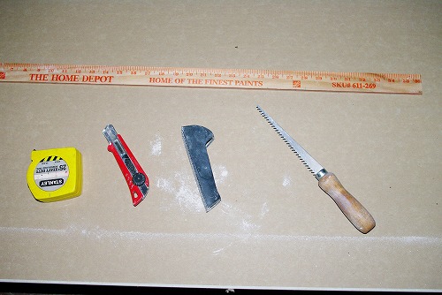 本日石膏ボード貼りで使用した、道具類を紹介します。手前右から左へです。石膏ボード用のこぎり(穴あけや、直線カットなど簡単に出来る石膏ボード専用ののこぎりです。)、 石膏ボード用鉋(粗いやすりです。これで、ボードの切り口を削り平滑にします。寸法調整などにも使用します。)、カッター、テープメジャーです。