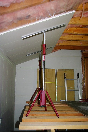 いつも一人で作業していますので、1.2m×2.4mの13ミリ石膏ボード(25キロ)を2.6mの天井に貼り付けるのは、至難の作業です。
