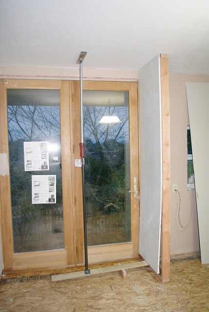 石膏ボードを貼るときのリフトアップの作業をピエール 突っ張り棒に代行してもらいました。