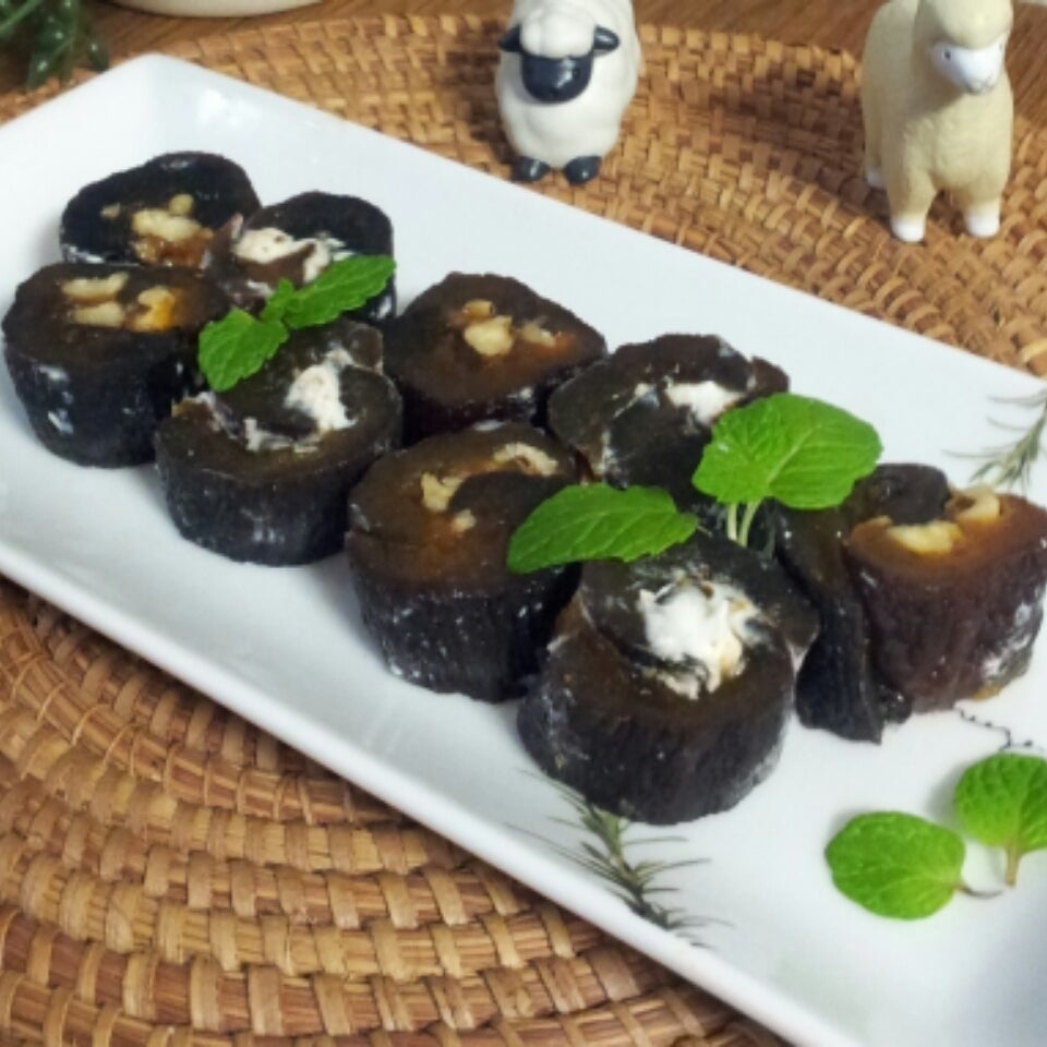干し柿を二枚にカットし、ラップを敷いた巻きすの上に置き、潰して適当な大きさにしたナッツを上に置いて端から巻いていく。ラップの両端をねじり形を落ち着かせる。クリームチーズの方も同様に作る。