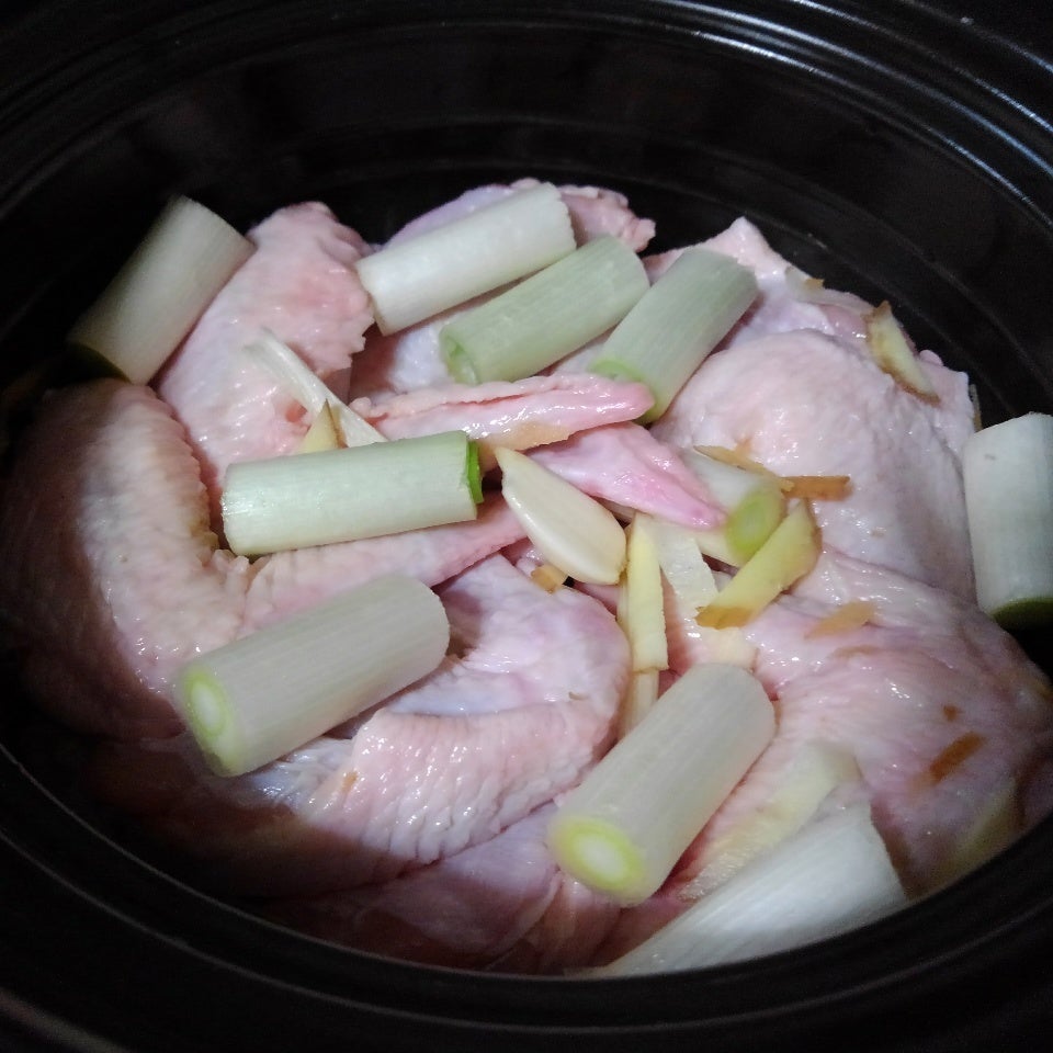 長ネギ1本をざく切りにし、にんにくは皮を剥ぎ、生姜は千切りにして手羽先と共に鍋に入れて、水をひたひたになるくらい入れて中火で煮る。