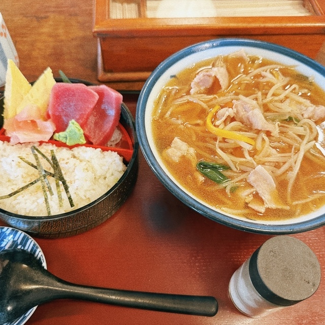 昨日の食生活備忘録_φこどもの日は職場で仕事しました。朝、ポークピカタ丼、大根味噌汁。昼、職場の同僚と食事✨ちらし寿司とお蕎麦@一乃庵