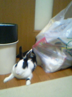 ゴミ袋とゴミ箱の間に寝そべってます。