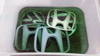 まずエンブレムのメッキを剥がす作業からです。メッキはABS樹脂の上に銅メッキその上からさらにメッキ加工がされ剥がすのも一苦労です…