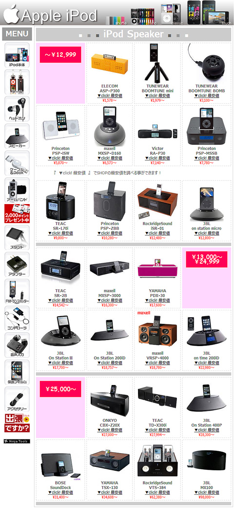 当ブログ『こだわる男の「モノ&ファッション」』では、Apple iPod、iPhone対応の人気スピーカーをご予算に応じて簡単に探すことができます。最安値もクリック一つで調べることができますのでお気軽に覗いてみてください!