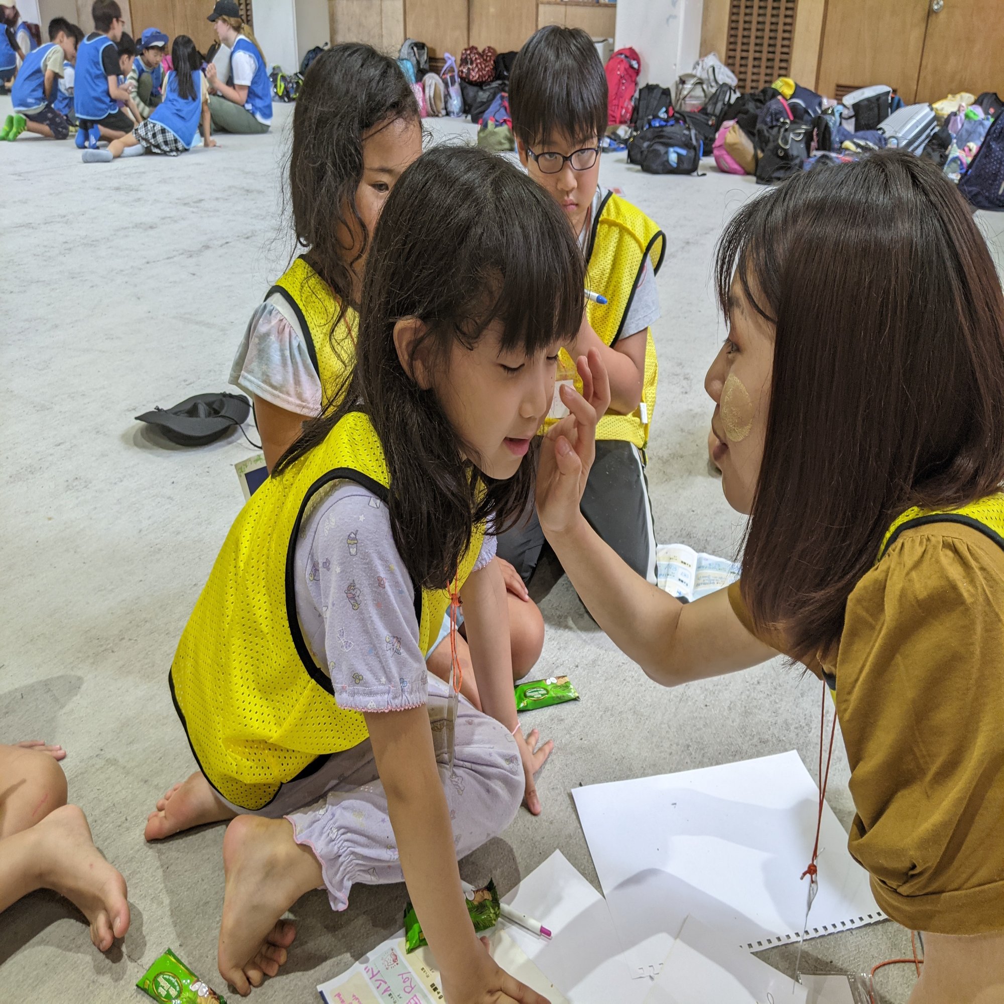日本人は化粧をするときは境目が分からないようにまんべんなく塗るので、ちょっとびっくりですね。こどもたちもドキドキしながらチャレンジしました。