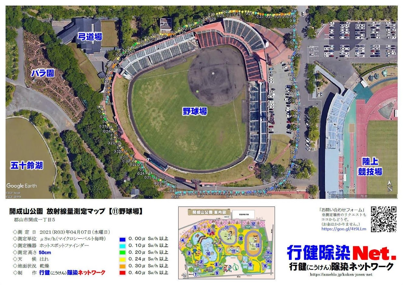 「開成山公園」スポーツ施設側(東側)の放射線量をはかりました。