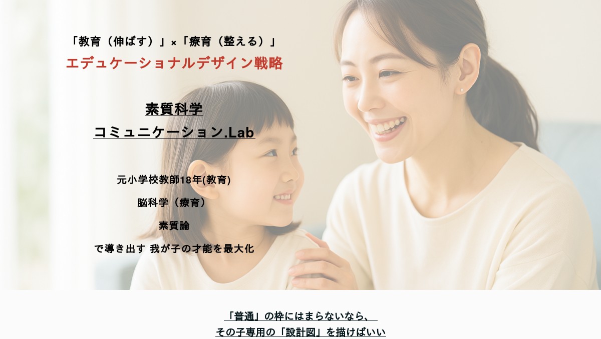 精神論ではなく、わが子専用の『エデュケーショナルデザイン(取扱説明書)』で、正解のない時代を生き抜く「自分軸」を育む、素質科学コミュニケーション.Labです。