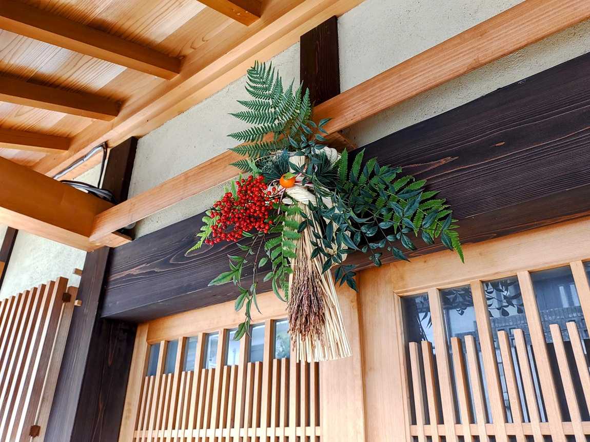 枚方では毎年恒例、ことほきの素の注連飾りに、庭にあるものを適当に挿し足すんですが、