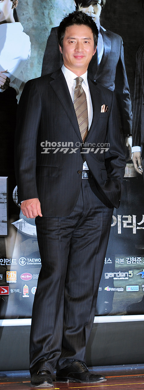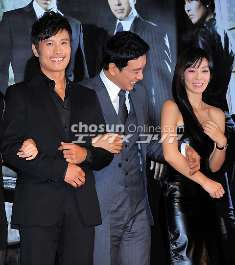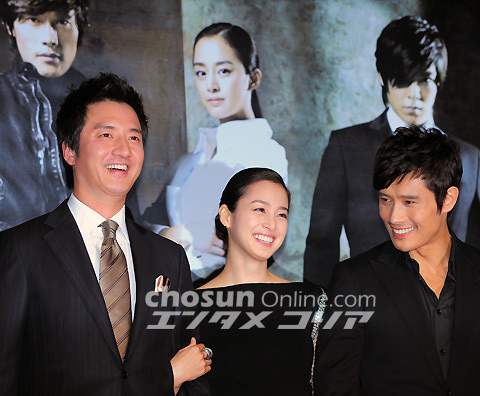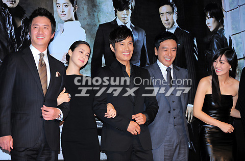 ロッテホテル(ソウル市中区小公洞)クリスタルボール・ルームで5日午後2時、水木ドラマ『アイリス』(KBS第2)制作発表会が行われた。写真は、笑顔でポーズを取るチョン・ジュノ、キム・テヒ、イ・ビョンホン、キム・スンウ、キム・ソヨン、BIG BANGのT.O.P(左から)。