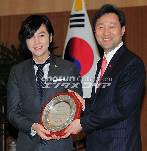 ソウル市PR大使のチャン・グンソク 20日午後3時、ソウル市庁別館(同市中区)で、「ソウル市PR大使任命式」が行われた。写真はPR大使に任命され、呉世勲(オ・セフン)同市市長と共に記念撮影をする俳優チャン・グンソク。 イ・デドク記者