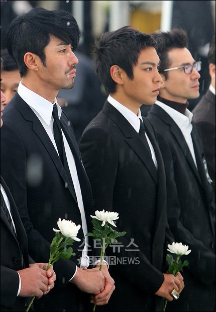 チャ・スンウォンとT.O.Pは黒いスーツに身を包み、午前11時ごろソウル広場に到着。悲痛な面持ちで弔問の列に並び、50分ほど順番を待っていた。この日は肌寒い一日となったが、故人をたたえる二人の厳かな姿に市民らも共感、哀悼の意を表していた。