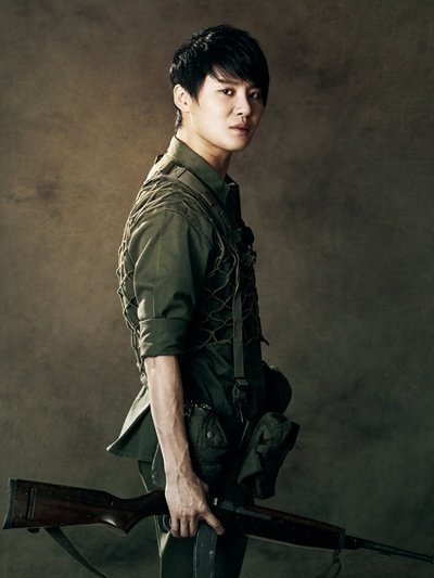写真のキム・ジュンスは軍服を着て、強烈なまなざしを向けている。