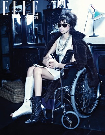 ファッション誌「ELLE(エル)」1月号で、コン・ヒョジンはハイヒールに夢中になったあげく、骨折するという女性をコンセプトにしたミステリアスな女性を表現。