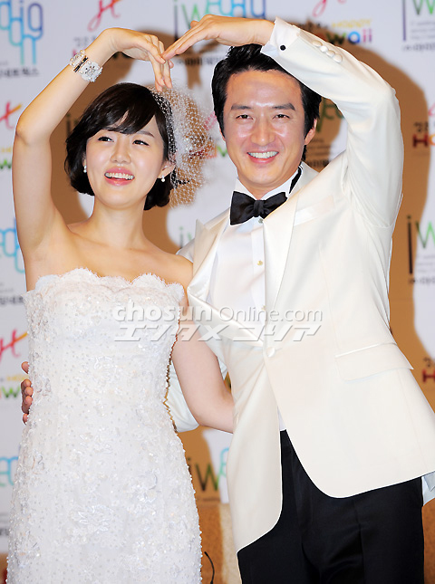 幸せいっぱいチョン・ジュノ&イ・ハジョン シェラトン・グランデ・ウォーカーヒル・ホテル(ソウル市広津区)で25日午後、俳優チョン・ジュノとイ・ハジョンMBCアナウンサーの結婚式が行われた。写真は、式に先立ち行われた記者会見でフォトタイムに応じるチョン・ジュノ&イ・ハジョン・アナ。 イ・デドク記者