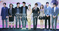「『イケメンラーメン店』見てね!」 27日午前、ソウル市江南区の映画館「CGV清潭シネシティー」で、ケーブルテレビチャンネルtvNの新ドラマ『イケメンラーメン店』制作発表会が行われた。写真はチョン・イル、イ・ギウ、イ・チョンアら同ドラマの出演者たち。 イ・デドク記者 朝鮮日報日本語版