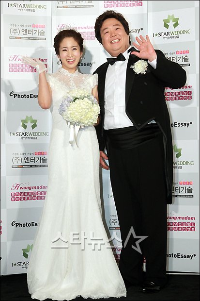 リュ・ダムが挙式 結婚式を控えたコメディアンのリュ・ダム(32)とチェ・ギョンウンさんが27日午後、63ビル(ソウル市永登浦区汝矣島)グランドボールルームで記者会見に臨んだ。写真は、手を振ってあいさつする二人。 STARNEWS/朝鮮日報日本語版