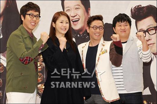『Go Show』制作発表会 28日午後、SBS(ソウル市陽川区)で新トーク番組『Go Show』制作発表会が行われた。写真はフォトタイムに応じるキム・ヨンチョル、コ・ヒョンジョン、ユン・ジョンシン、チョン・ヒョンドン(左から)。 朝鮮日報日本語版