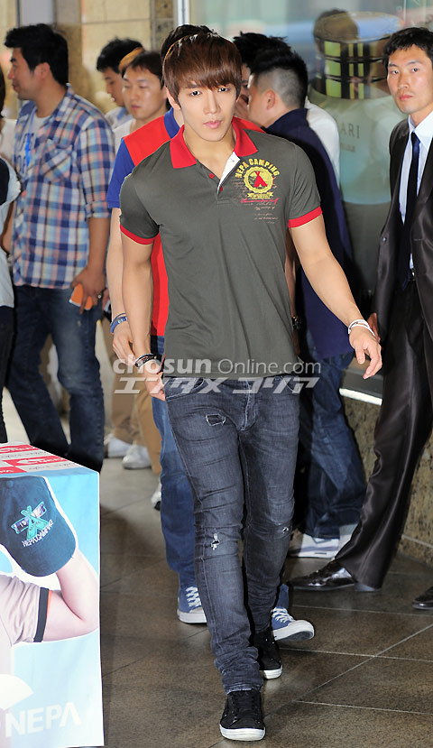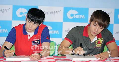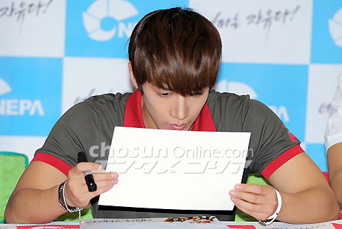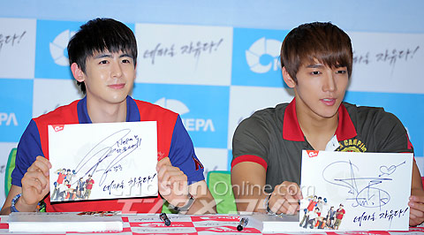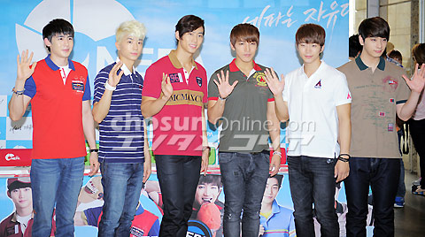 2PMファンサイン会 29日午前、ロッテデパート(ソウル市中区)で、アウトドアブランド「NEPA」のイメージキャラクターを務める2PMのサイン会が行われた。写真はフォトセッションに応じるニックン、ウヨン、テギョン、ジュンス、ジュノ、チャンソン(左から)。 イ・デドク記者 朝鮮日報日本語版