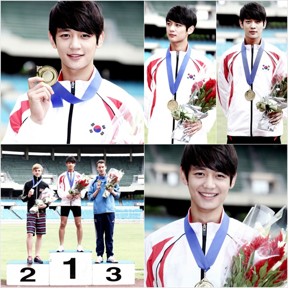 この写真には、才能ある走り高跳び選手カン・テジュンを演じるミンホが金メダルを首にかけ、堂々としたポーズを取っている姿が収められている。