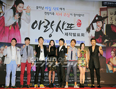 『アラン使道伝』制作発表会 10日午後、グランドアンバサダーホテル(ソウル市中区)でMBCの新水木ドラマ『アラン使道伝』制作発表会が行われた。写真はフォトタイムに応じるパク・ジュンギュ、ユ・スンホ、ヨン・ウジン、シン・ミナ、イ・サンホ監督、イ・ジュンギ、クォン・オジュン、ファン・ボラ、ハン・ジョンス(左から)。 イ・デドク記者 朝鮮日報日本語版