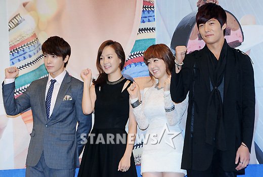 SJドンヘ主演『パンダさんとハリネズミ』制作発表会 16日午後、インペリアル・パレス・ホテル(ソウル市江南区)で、チャンネルAの週末ドラマ『パンダさんとハリネズミ』の制作発表会が行われた。写真は、フォトタイムに応じるSUPER JUNIORのドンヘ、ユン・スンア、ユ・ソヨン、チェ・ジニョク(左から)。 STARNEWS/朝鮮日報日本語版