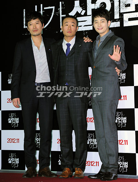 映画『私が殺人犯だ』メディア試写会 29日午後、東大門メガボックス(ソウル市中区)で、映画『私が殺人犯だ』のメディア試写会・記者懇談会が行われた。写真は、フォトタイムでポーズを取っているチョン・ジェヨン、チョン・ビョンギル監督、パク・シフ(左から)。 イ・デドク記者 朝鮮日報日本語版