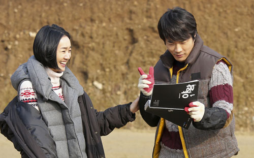 公開された2枚の写真は全く違う雰囲気のもの。1枚目の写真はクォン・サンウがコミカルなせりふでオーバーアクションを見せたところ、スエがこらえきれずに笑い出してしまった瞬間のショット。2枚目は真剣な表情でせりふ合わせをしているものだ。