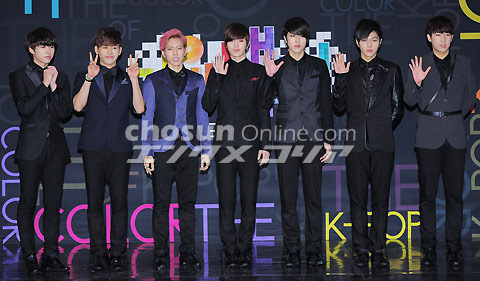 黒いINFINITE INFINITEが29日、高麗大学のファジョン体育館(ソウル市城北区)で行われた「2012 SBS歌謡大典」に出演。写真は、レッドカーペットイベントに出席し、ポーズを取っているINFINITEのメンバー。 イ・デドク記者 朝鮮日報日本語版