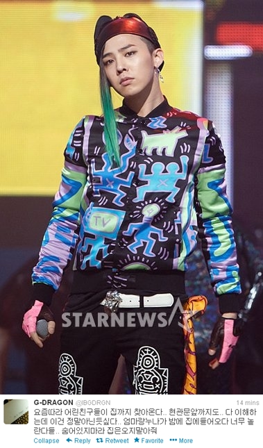 28日午後、G-DRAGONはツイッターに「最近になって、若い子たちが家まで来るようになった。玄関の門の前までも。気持ちは分かるけれど、本当にこれは違うと思う」とし、「母や姉が夜帰宅してすごく驚いていた。隠れていないで。家には来ないでくれ」と家族の精神的苦痛を訴え、ファンに注意を呼びかけた。