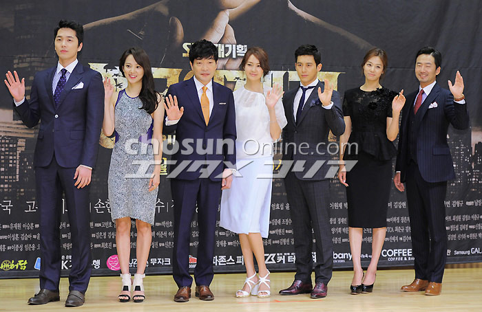 『黄金の帝国』制作発表会 ソウル市陽川区のSBS社屋で25日午後、ドラマ『黄金の帝国』の制作発表会が行われた。写真は左からイ・ヒョンジン、ユン・スンア、ソン・ヒョンジュ、イ・ヨウォン、コ・ス、チャン・シニョン、リュ・スンス。 イ・デドク記者 朝鮮日報日本語版