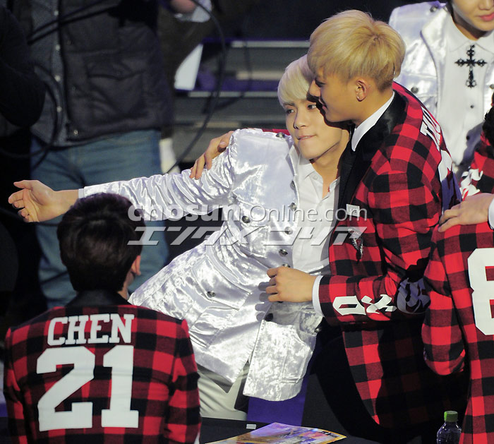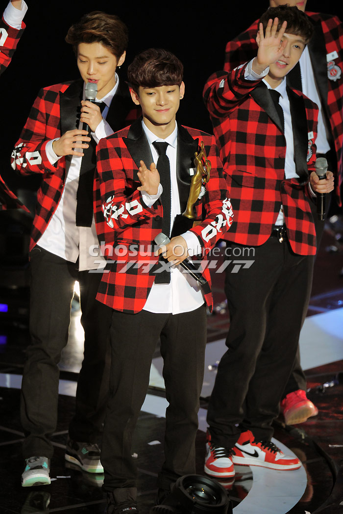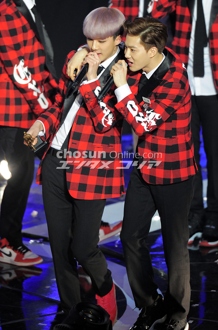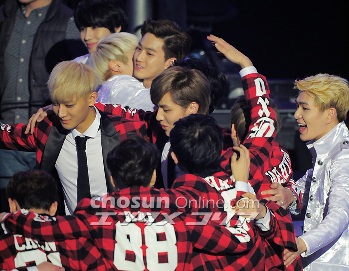 大賞の喜び語るEXO=ソウル歌謡大賞 ソウル市内の蚕室室内体育館で23日午後、第23回ハイワン・ソウル歌謡大賞授賞式が行われ、人気グループEXOが大賞を受賞した。写真は受賞後、感想を述べるEXO。 イ・デドク記者 朝鮮日報日本語版