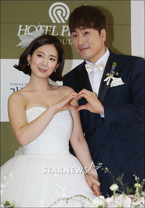 ファン・ヨンジン&キム・ダソム「きょう結婚します!」 お笑い芸人ファン・ヨンジンと10歳年下のキム・ダソムさんが16日午後、プリマホテル(ソウル市江南区)グランドボールルームで結婚式を挙げた。写真は、式に先立ち記者会見に臨む2人。 イ・ドンフン記者 STARNEWS/朝鮮日報日本語版