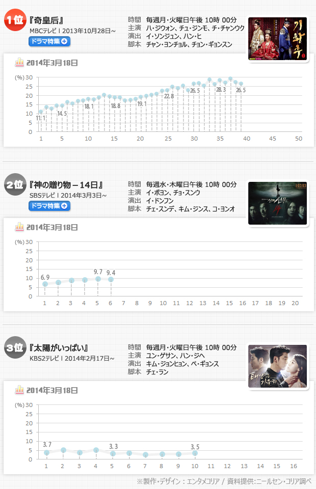 視聴率:『奇皇后』26.5% 月火ドラマ『奇皇后』(MBC)の視聴率がややダウンした。 18日に放送された『奇皇后』の視聴率は、前日放送分(27.2%)に比べ0.7ポイント減の26.5%(19日、ニールセン・コリア調べ、以下同じ)だった。 なお、同時間帯に放送された『神の贈り物-14日』(SBS)は9.4%、『太陽がいっぱい』(KBS第2)は3.5%。 朝鮮日報日本語版
