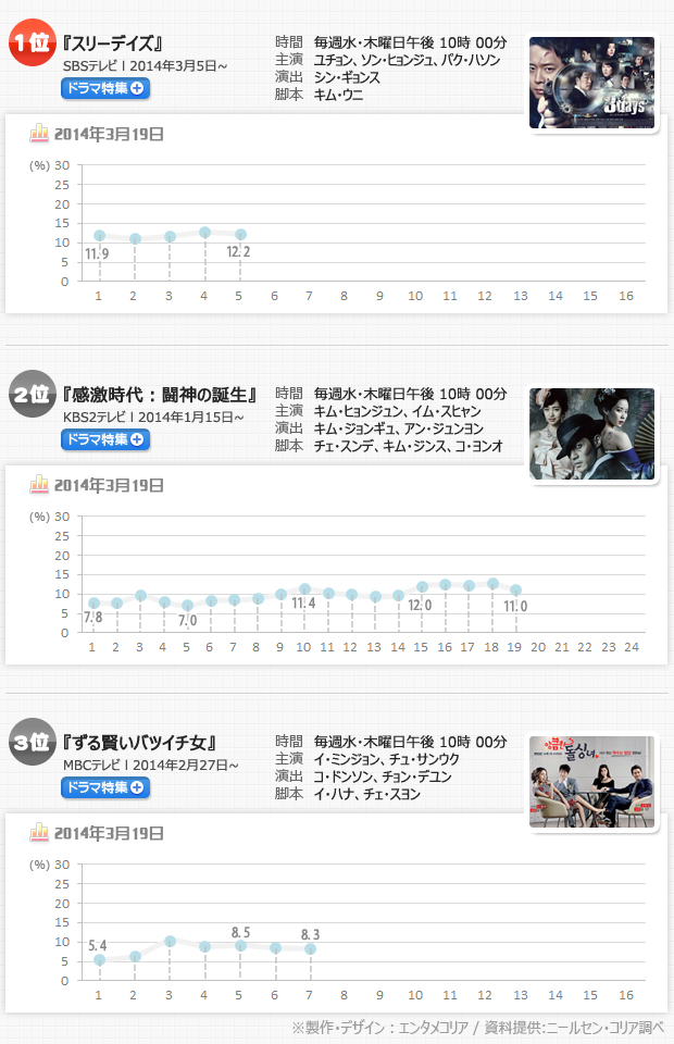 視聴率:『スリーデイズ』12.2% 『スリーデイズ』(SBS)が水木ドラマのうち視聴率1位をキープしている。 19日に放送された『スリーデイズ』の全国視聴率は12.2%(20日、ニールセン・コリア調べ、以下同じ)をマークした。これは前回放送分(12.7%)に比べ0.5ポイント下回る数字だ。 なお、同時間帯に放送された『感激時代:闘神の誕生』(KBS第2)は11.0%、『ずる賢いバツイチ女』(MBC)は8.3%だった。 朝鮮日報日本語版