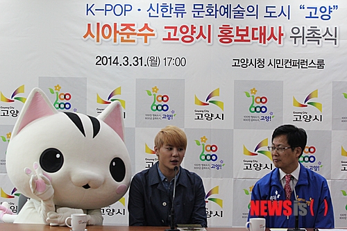 JYJジュンス、高陽市の広報大使に 3月31日午後、JYJのメンバー、ジュンスが京畿道高陽市庁のカンファレンスルームで、高陽市広報大使に任命された。写真は、同市の崔星(チェ・ソン)市長と記念撮影をするジュンス。 イ・ギョンファン記者 NEWSIS/朝鮮日報日本語版