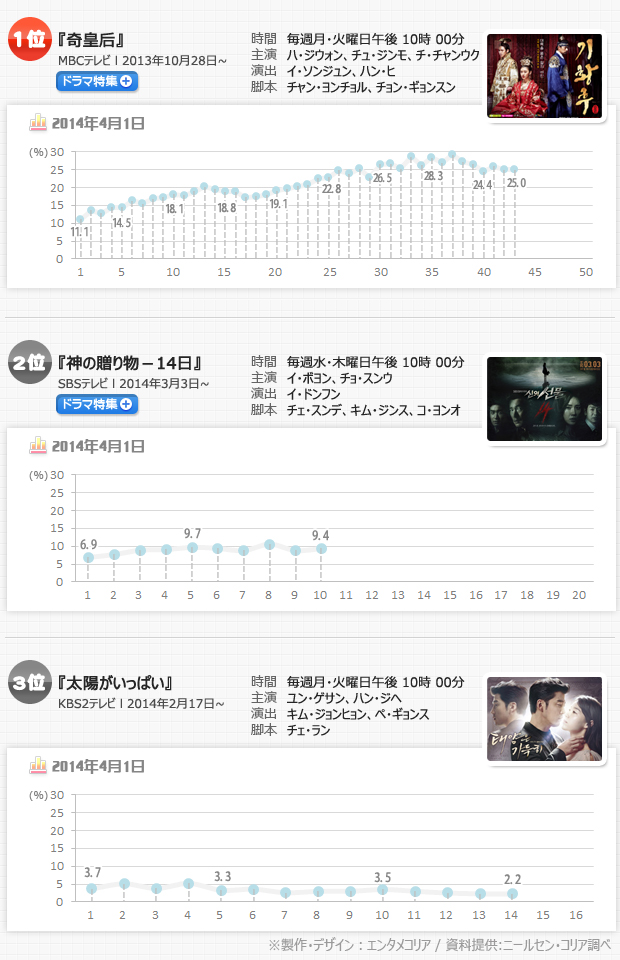 視聴率:『奇皇后』25.0% 『奇皇后』(MBC)が月火ドラマで視聴率1位をキープしている。 1日に放送された『奇皇后』の視聴率は、前日放送分と同じく25.0%(2日、ニールセン・コリア調べ、以下同じ)だった。 なお、『神の贈り物-14日』(SBS)は9.4%、『太陽がいっぱい』(KBS第2)は2.2%。 朝鮮日報日本語版
